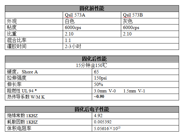 QSil 573 是一种用于电子类灌封的 100% 固体弹性硅胶,具有一定的硬度、优良的热传导性能,低模量和快速修复性能的双组分材料。